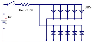 The light will be provided by two 5 LEDs arrays in parallel as seen in the following circuit schematic.