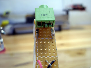 Simply solder the jack socket to the perf board (which should be cut to fit inside the gutted lipstick ) and put a resistor in series for each channel (left and right). Then connect the jack plug to the resistors and to ground by using the wire.