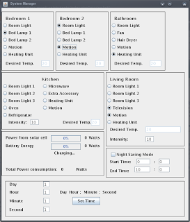 Since this is a small project, we do not have the actual house or its hardware, so we resorted to simulate it using a second FPGA board and another computer. The second computer controls the house status (temperature in each room, level of room light, motion in the rooms, status of the TV, etc) and offers an inteface so the user can turn on lights, move in a room, set the desired room temperature, turn on the microwave oven, etc. All this information is serially sent to the second FPGA board which then adjusts its pins status to mimic the house hardware.