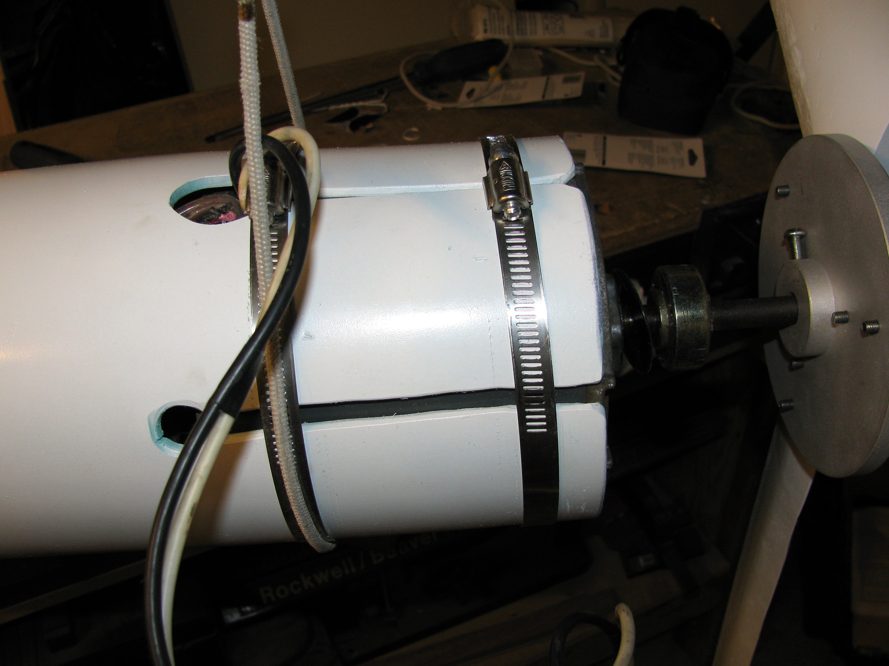 The turbine (generator and body) is mainly held together by stainless steel 8″ and 10″ pipe clamps. The tail is held with heavy duty cable ties, and the blades are bolted to a beautiful custom-machined flywheel held to the rotor shaft by two setscrews. The turbine is held to the mast by a pipe-flange, a wooden support, and wood-screws.