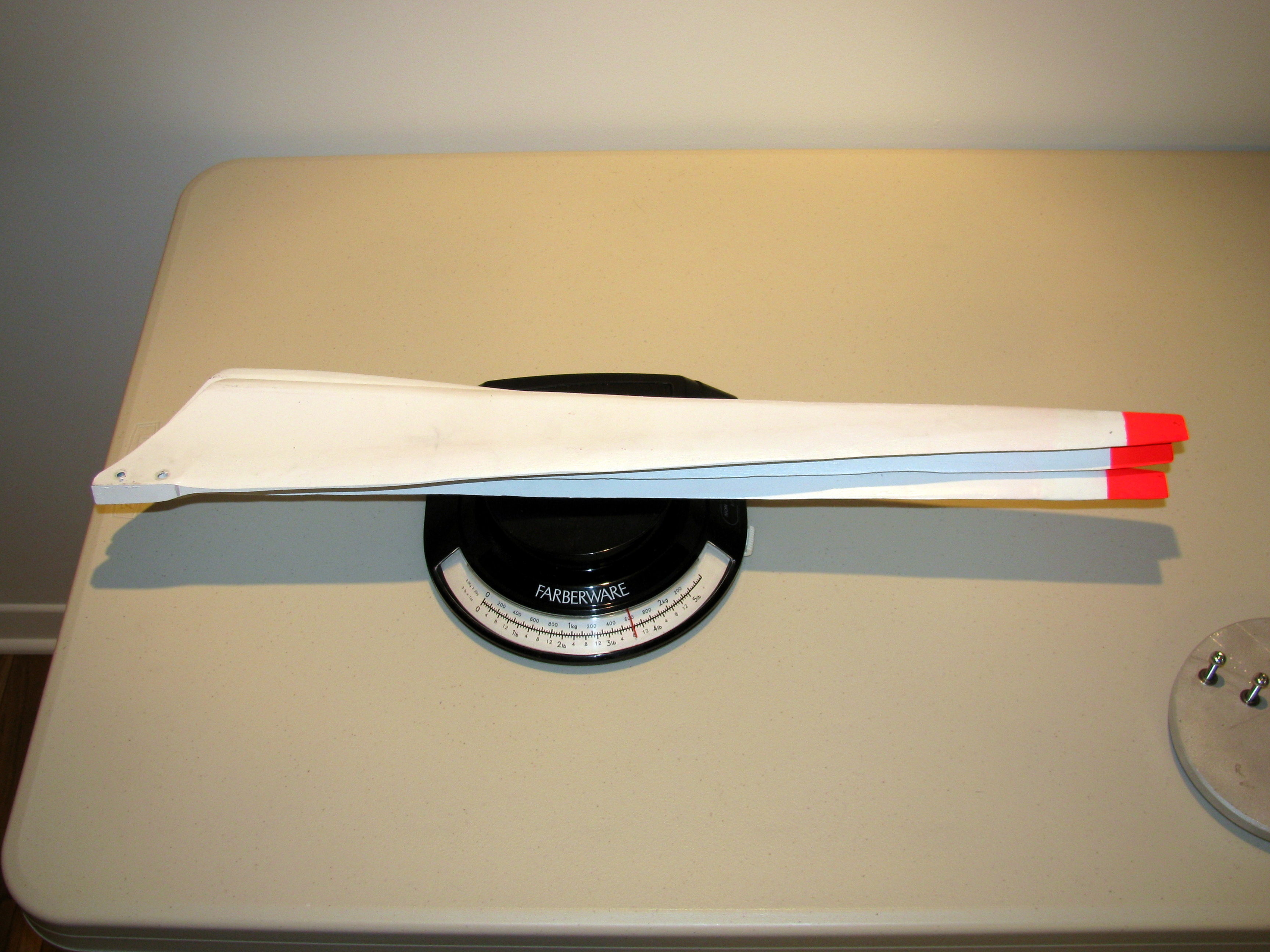 The generator is connected to a charger and a car battery through a two conductor exterior cable that is fed trough the mast and goes through the flange, the wooden support, and the body. It is also important to note that the blades must be balanced so the turbine does not oscillate (or wobble) when hit by the wind. Finally, making sure that the pivoting point is at the turbine’s centre of mass is crucial since it allows the turbine to be easily oriented by the wind direction. As depicted below, this can be done by suspending the turbine from a thread and shift it until it is balanced.