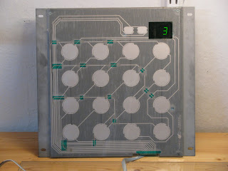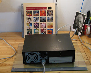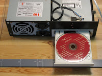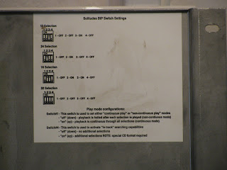 One might think that the shelf contains a CD library that plays the selected CD on command (that is what I thought anyways). But it is much simpler than that. The system consists of a computer CD drive connected to a small computer power supply and a sort of IDE controller (run by a microcontroller). The IDE controller is told what to do by the user interface, a sort of large keypad hooked up to a(nother) microcontroller. The sound is taken from the CD drive by using the standard audio port.