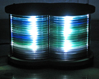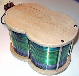 To make a nice looking lamp that uses CDs to shade the light. The lamp should be composed of two overlapping columns of CDs sandwiched between identical pieces of wood. It should be very energy efficient and output a reasonable amount of light (which implies LEDs).