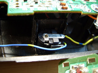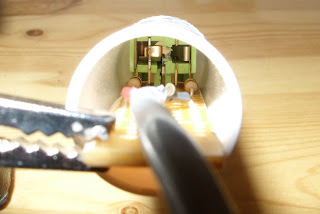 Simply solder the jack socket to the perf board (which should be cut to fit inside the gutted lipstick ) and put a resistor in series for each channel (left and right). Then connect the jack plug to the resistors and to ground by using the wire.