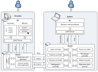 The system consists of a PC that takes high level decisions for the control of lighting, heating and power consumption in general for a house. This decisions are serially sent to an FPGA board that take some lower level decisions (such as debouncing switches, counting time, etc) and controls trough a very large number of IO pins (~90) the actual house hardware.