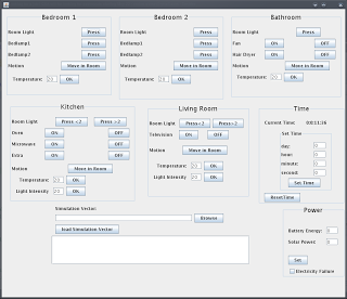Since this is a small project, we do not have the actual house or its hardware, so we resorted to simulate it using a second FPGA board and another computer. The second computer controls the house status (temperature in each room, level of room light, motion in the rooms, status of the TV, etc) and offers an inteface so the user can turn on lights, move in a room, set the desired room temperature, turn on the microwave oven, etc. All this information is serially sent to the second FPGA board which then adjusts its pins status to mimic the house hardware.