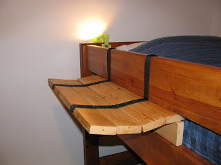 I wanted to build a bedside table for the top bed on a bunk bed but I did not want it to become a head-banging hazard for those sleeping under it. So the table has to be rigid as seen from the top and mobile for those under it. My solution: a folding bedside table.