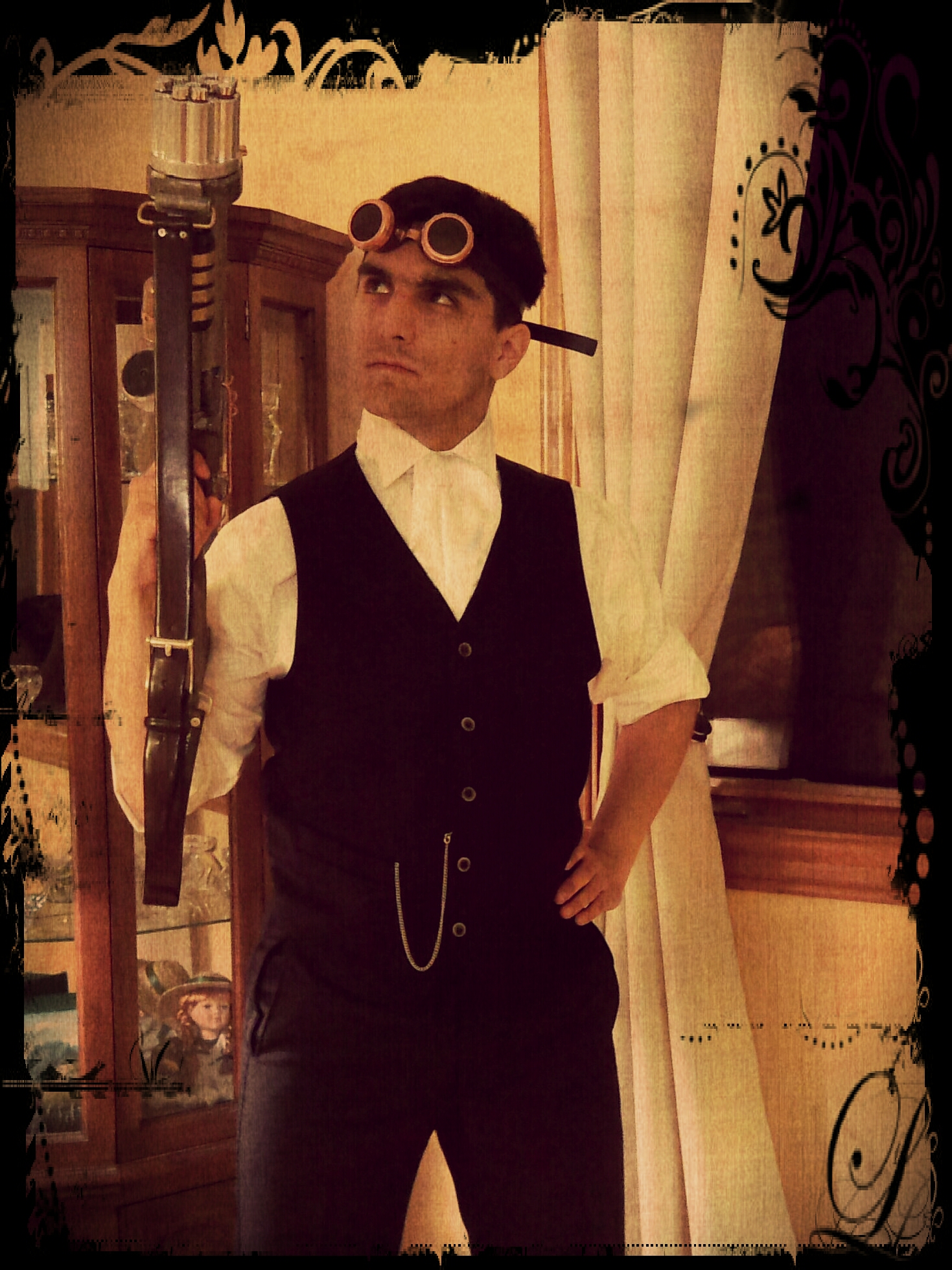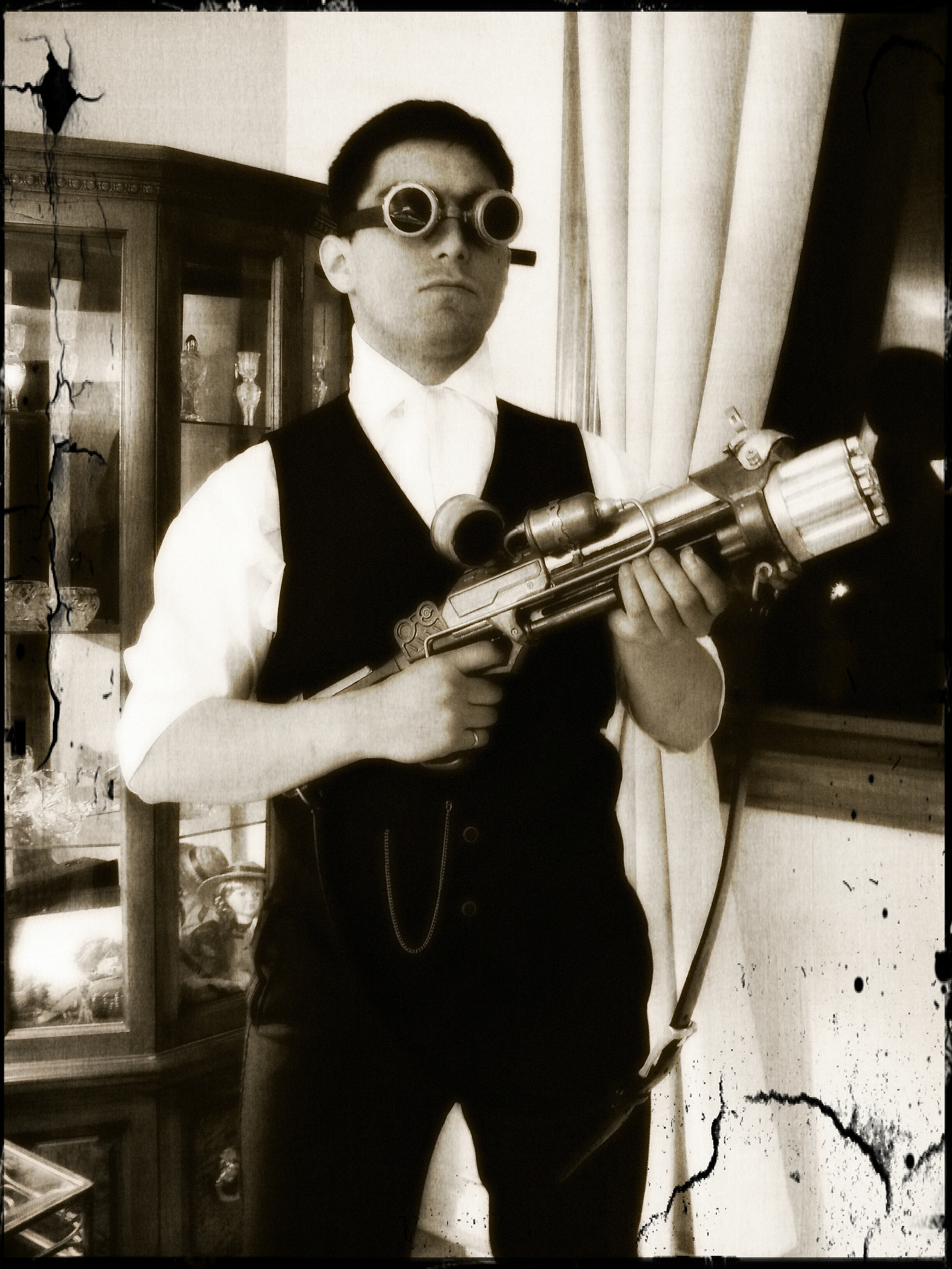 I wanted to have a steampunk disguise for a long time and this was the perfect excuse to do it, or actually to have my brother, Alan, do it for me. While I worried about the clothes, he built an awesome steampunk gun based on a cheap Nerf knock-off and some goggles using plumbing parts. See the awesome results below.