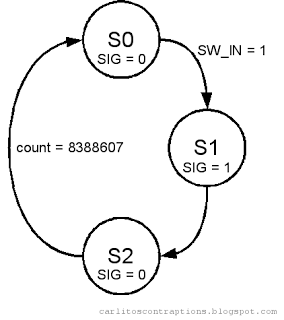 When SW_IN goes high, the module outputs a once-clock-cycle wide pulse on the next clock rising edge. Then it waits for 8388607 clock cycles (~ 0.17 s when clocked @ 50MHz). This is illustrated in the state transition diagram below.