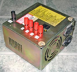 In order to pack everything inside the PS case, I drilled 5 holes for the banana connectors, 2 smaller holes for the 2 LEDs, and drilled and filed a rectangular hole for the switch (I know, it would have been much simpler to use a round switch). Since everything fits very tightly in the case, the holes placement must be carefully planned so the added parts won’t interfere with the PS (i.e. stop the fan, make undesired connections between the components).