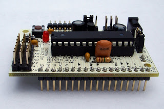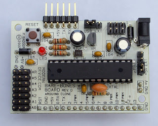 For my birthday my girlfriend got me 4 Bare-Bone Boards (from the Modern Devices Company). The boards are fully featured Arduino clones. The only difference with the original Arduino (AFAIK) is that they are cheaper (15$ each or less) and better suited for breadboard connection.