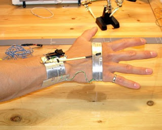 The wrist and hand pieces are linked together bu a street cleaner brush bristle. The bristle is bent in a “Z” shape and goes into a hole at center top of the hand piece. The other end of the bristle is slightly bent upwards (so it doesn’t go into my arm when I move my hand) and goes trough a wire tie loop on the top of the wrist. A paper clip is soldered into this end and is connected to the linear potentiometer. The I heated and Inserted the clip into the plastic potentiometer tab, this creates a nice and strong link. The paperclip provides flexibility and allows the and to move beyond the range of motion of the potentiometer.