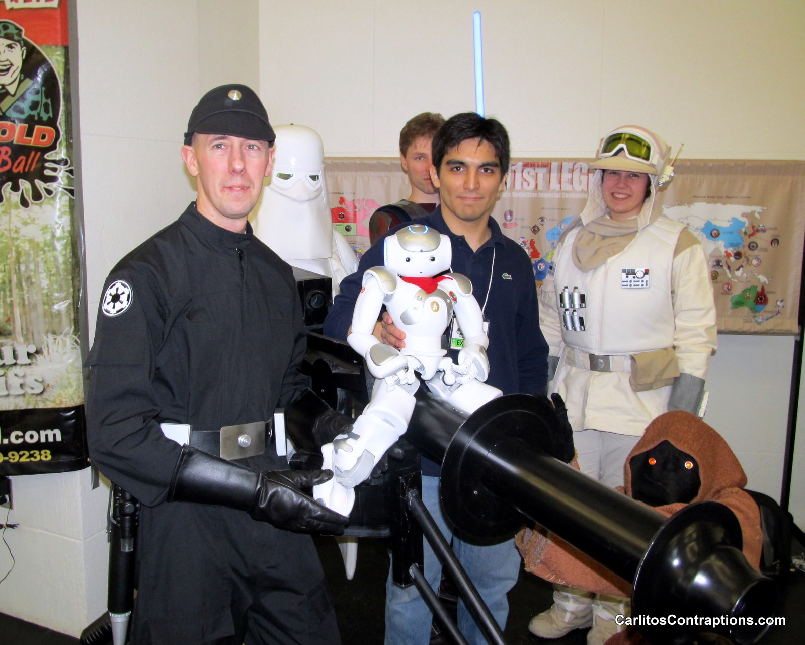 Nao 1337 was very popular with pretty much everybody and we made lots of friends. Nao got some Ubuntu stickers, could sit on a Star Wars cannon, and even learned a magic trick. In the picture above you see Nao 1337 actually chilling out (his motors were hot after some intense dancing).