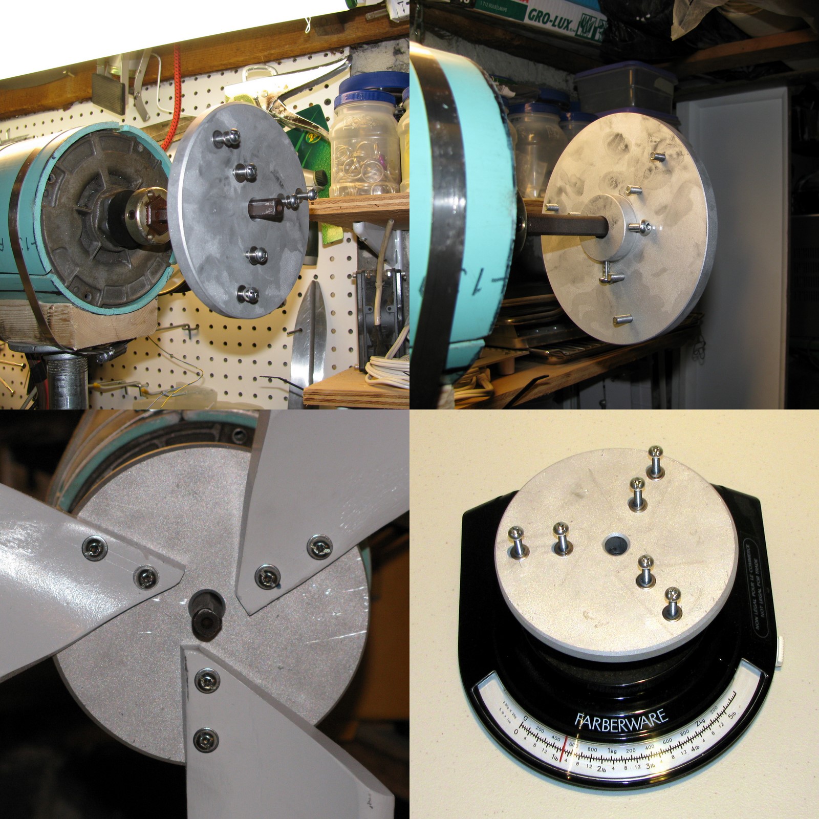 The turbine (generator and body) is mainly held together by stainless steel 8″ and 10″ pipe clamps. The tail is held with heavy duty cable ties, and the blades are bolted to a beautiful custom-machined flywheel held to the rotor shaft by two setscrews. The turbine is held to the mast by a pipe-flange, a wooden support, and wood-screws.