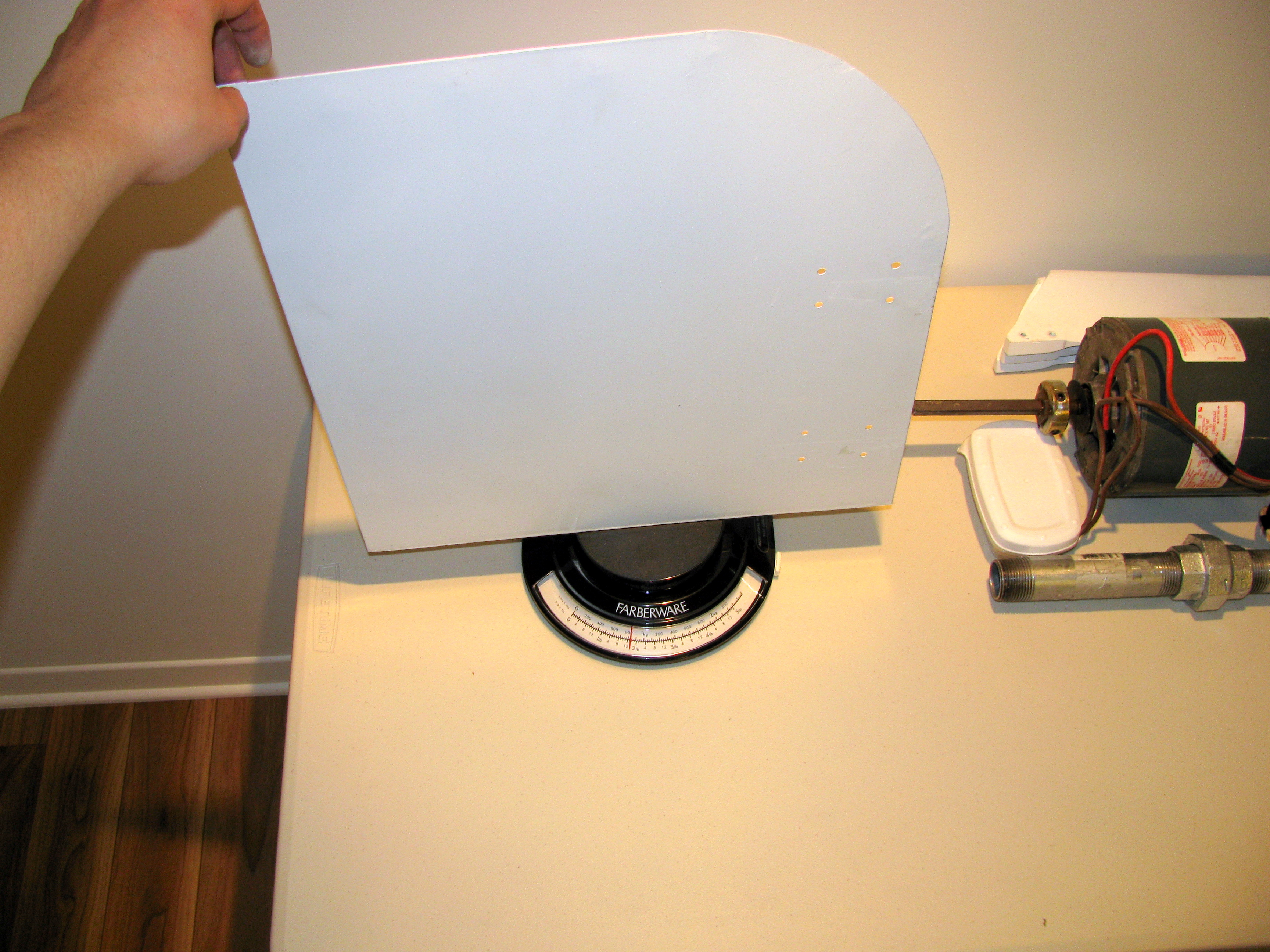 The generator is connected to a charger and a car battery through a two conductor exterior cable that is fed trough the mast and goes through the flange, the wooden support, and the body. It is also important to note that the blades must be balanced so the turbine does not oscillate (or wobble) when hit by the wind. Finally, making sure that the pivoting point is at the turbine’s centre of mass is crucial since it allows the turbine to be easily oriented by the wind direction. As depicted below, this can be done by suspending the turbine from a thread and shift it until it is balanced.