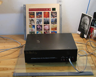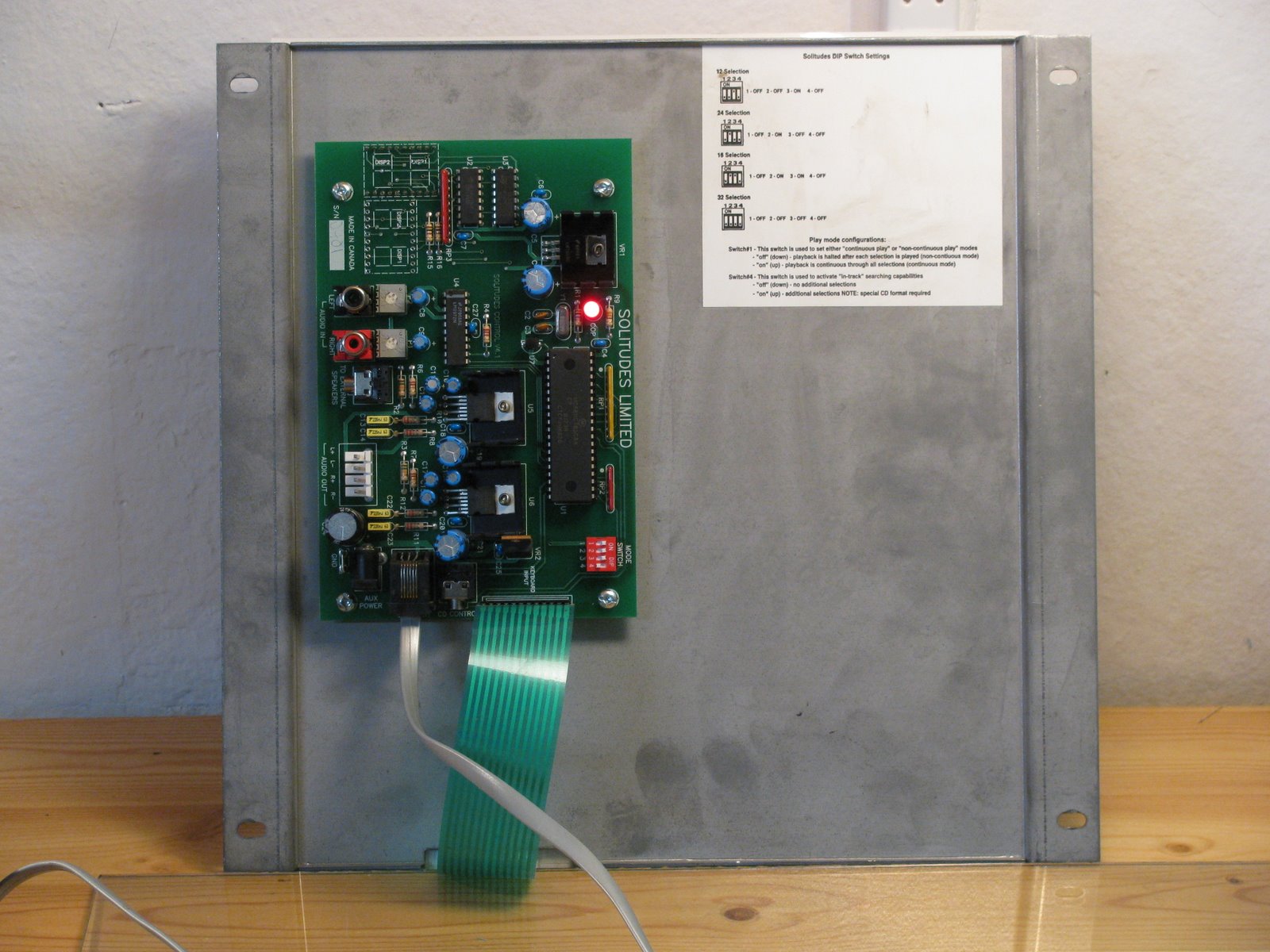 One might think that the shelf contains a CD library that plays the selected CD on command (that is what I thought anyways). But it is much simpler than that. The system consists of a computer CD drive connected to a small computer power supply and a sort of IDE controller (run by a microcontroller). The IDE controller is told what to do by the user interface, a sort of large keypad hooked up to a(nother) microcontroller. The sound is taken from the CD drive by using the standard audio port.